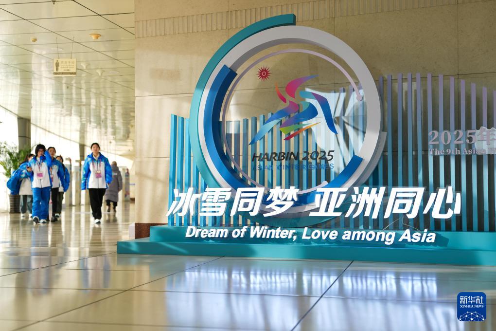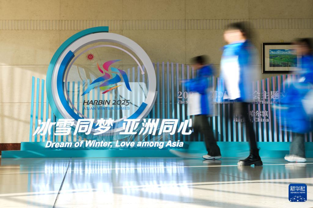 2月5日,志愿者經(jīng)過(guò)主新聞中心的一處亞冬會(huì)主題裝飾。