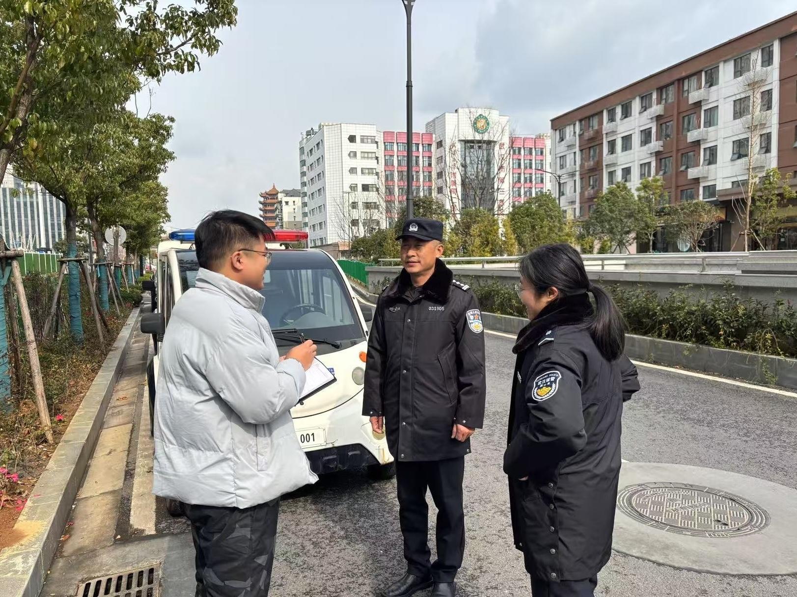 圖為記者(左)采訪正在路邊執(zhí)勤的黃鶴樓派出所社區(qū)民警許曉翔(中)。王靜蕓 攝