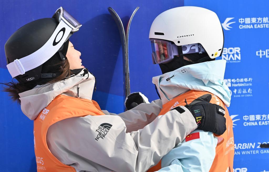 2月8日,李方慧(右)在比賽后與銀牌得主、中國(guó)隊(duì)選手張可欣互相祝賀。新華社記者 楊晨光 攝