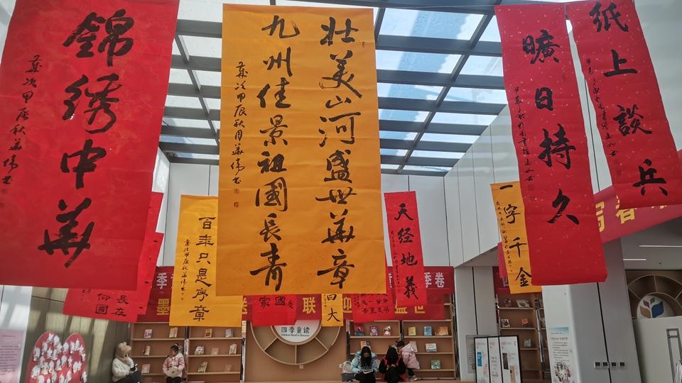 魏縣圖書館的四季童書閱覽區(qū)內(nèi)懸掛著書法條幅。魏縣縣委宣傳部供圖(王德峰 攝)