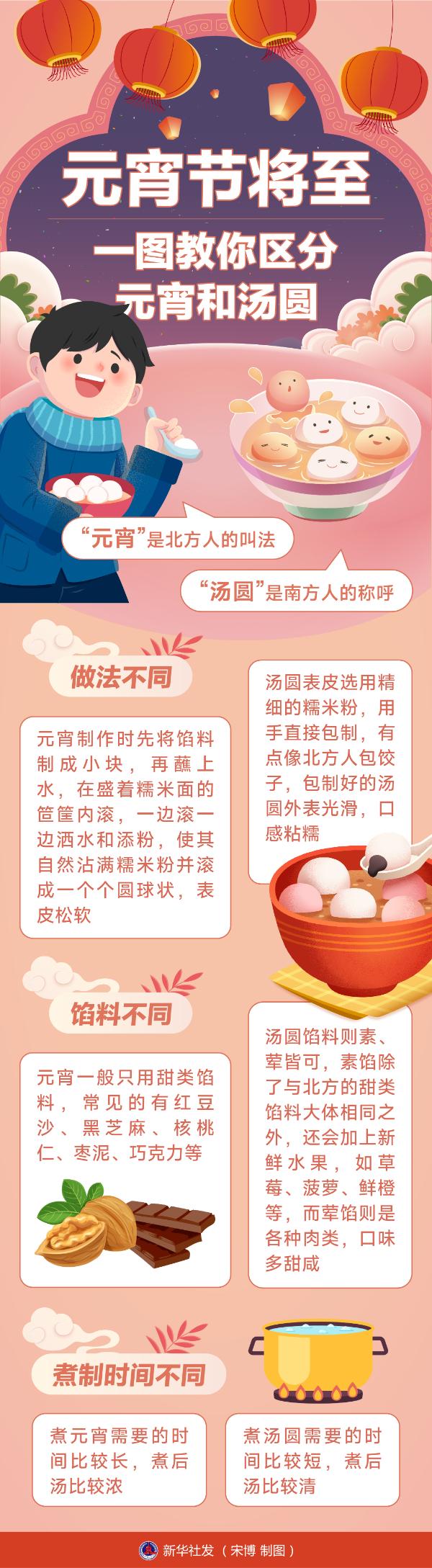 “元宵”是北方人的叫法,“湯圓”是南方人的稱(chēng)呼,二者都是糯米粉制品,卻有著諸多不同。一圖教你區(qū)分元宵和湯圓。