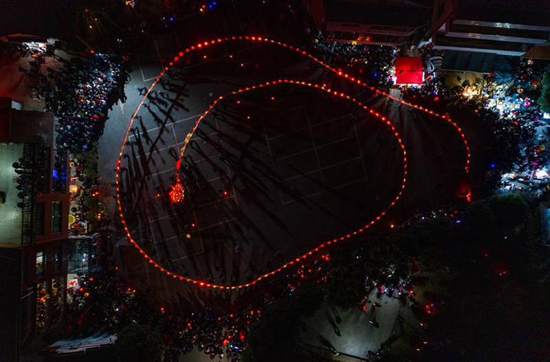 當(dāng)晚6點(diǎn)開始,伴隨著熱鬧的鑼鼓聲,陣陣響亮的炮仗聲,一條由100多節(jié)板凳聚合而成的長(zhǎng)龍流光溢彩,格外顯眼。
