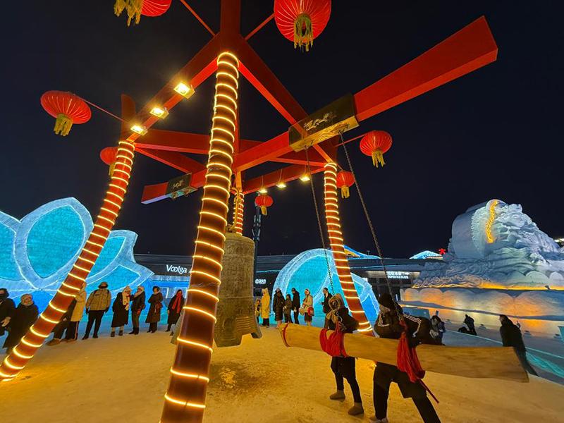 游客敲響哈爾濱冰雪大世界里的世紀鐘迎接元宵佳節(jié)。新華社記者 楊思琪 攝