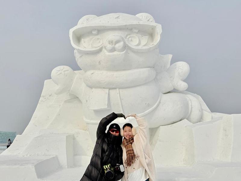 在哈爾濱冰雪大世界,來自臺灣的“95后”游客蔡湘庭正與亞冬會吉祥物“濱濱”“妮妮”的冰雕、雪雕合影?!皝磉@里正好趕上元宵節(jié),紅彤彤的裝飾和熱情的人們,讓我覺得非常友好。”她說。
