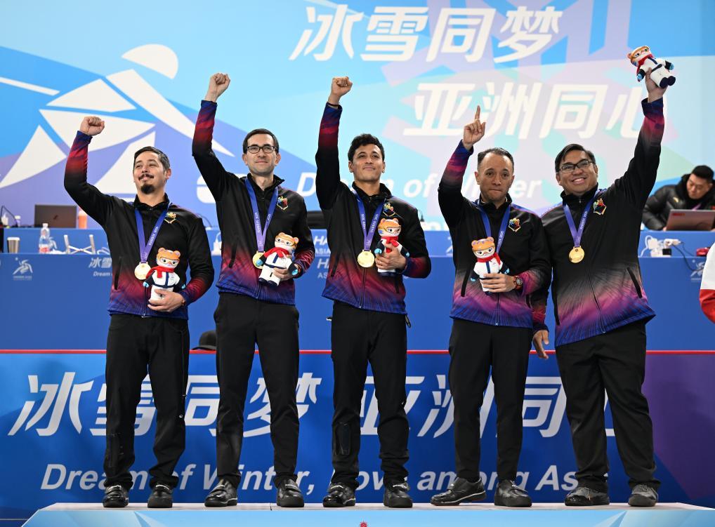 2月14日,菲律賓隊(duì)選手在頒獎(jiǎng)儀式上。當(dāng)日,第九屆亞冬會(huì)男子冰壺頒獎(jiǎng)儀式在哈爾濱舉行。新華社記者 趙子碩 攝