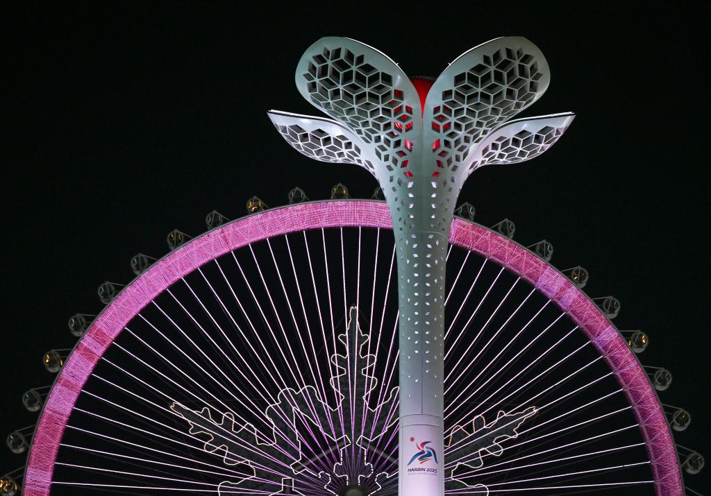 當(dāng)喧囂的賽場(chǎng)漸漸沉寂,當(dāng)忙碌的身影停下腳步,開幕式上的巨型冰燈返場(chǎng),鏡頭來(lái)到分會(huì)場(chǎng)。夜空之下,冰雪大世界里,雪花摩天輪前,亞冬圣火緩緩熄滅,絢麗燈光灼灼其華。