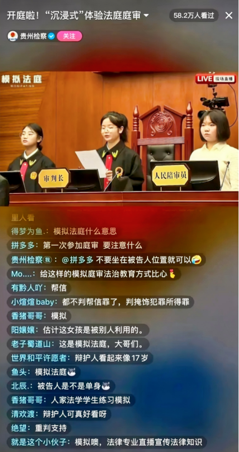 貴州省人民檢察院傾力打造“我是檢察官·直播間”原創(chuàng)普法IP,聯(lián)合黨政機關、學校等開展普法活動,打造“檢察官+”普法宣傳模式,通過模擬法庭、專家講解、互動答疑等形式,將司法實踐與線上直播結(jié)合,讓法律知識“活”起來,群眾可以沉浸式體驗“司法活動”和“檢察辦案”等。