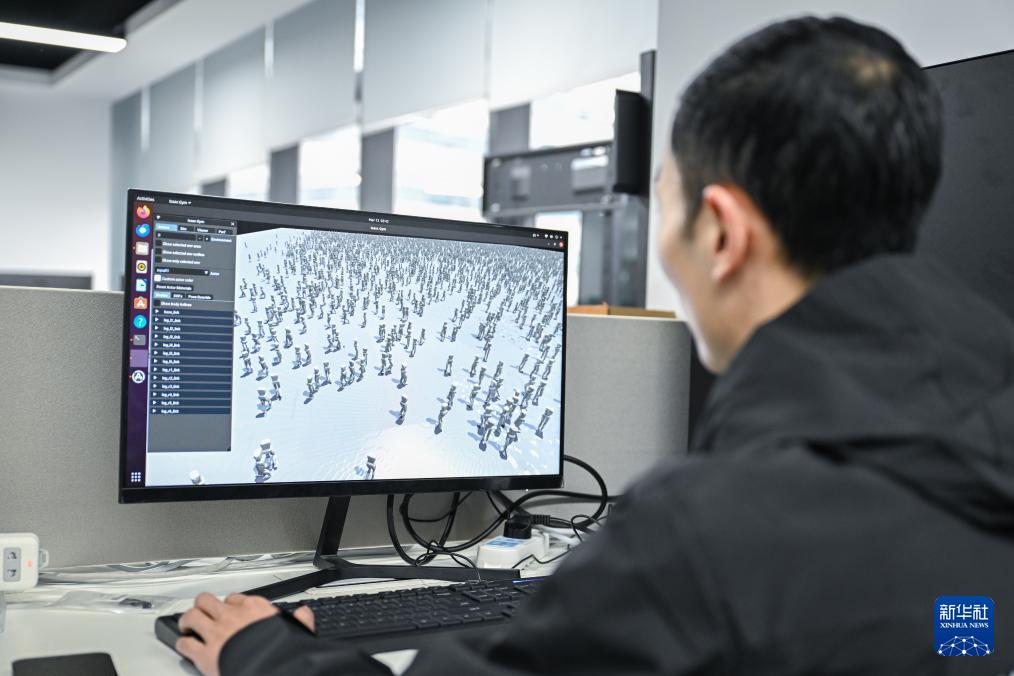 ??3月13日,在武漢灝存科技有限公司,工程師付龍?jiān)诓榭礄C(jī)器人動(dòng)作訓(xùn)練平臺(tái)。
