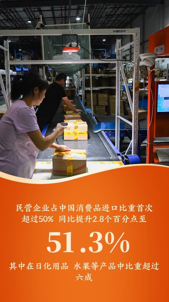 民營企業(yè)占我國消費品進(jìn)口比重首次超過50%,同比提升2.8個百分點至51.3%,其中在日化用品、水果等產(chǎn)品中比重超過六成。