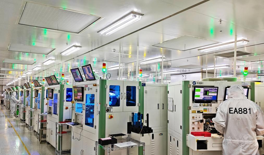 4月3日在重慶市天實(shí)精工科技有限公司無塵車間拍攝的攝像頭模組自動(dòng)化生產(chǎn)作業(yè)現(xiàn)場(chǎng)。新華社發(fā)(田浩良攝)