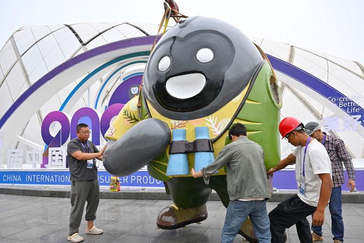 4月10日,工作人員在擺放消博會吉祥物。 新華社記者 郭程 攝