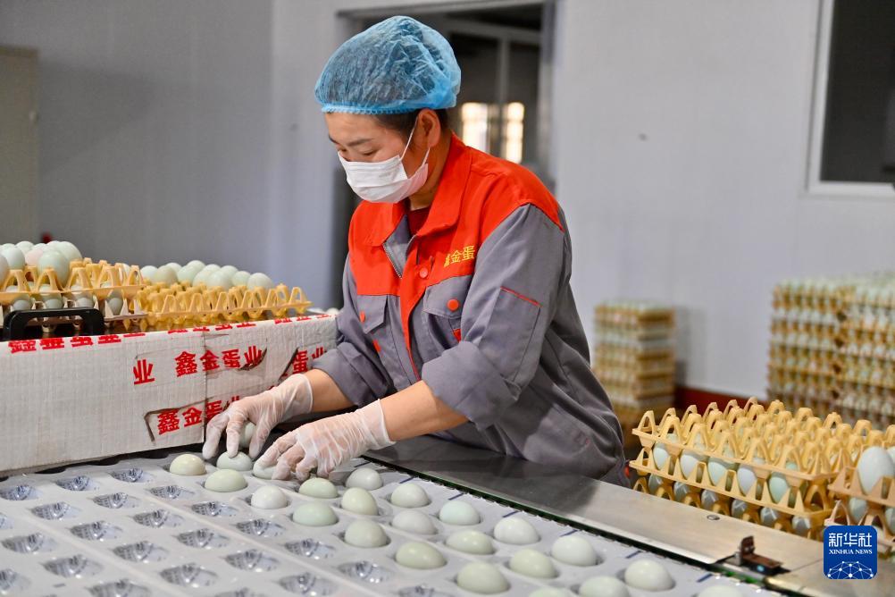 4月24日,在位于遼陽市的遼寧鑫金科技實業(yè)集團有限公司的加工廠內,工人將鴨蛋碼放到生產線上。