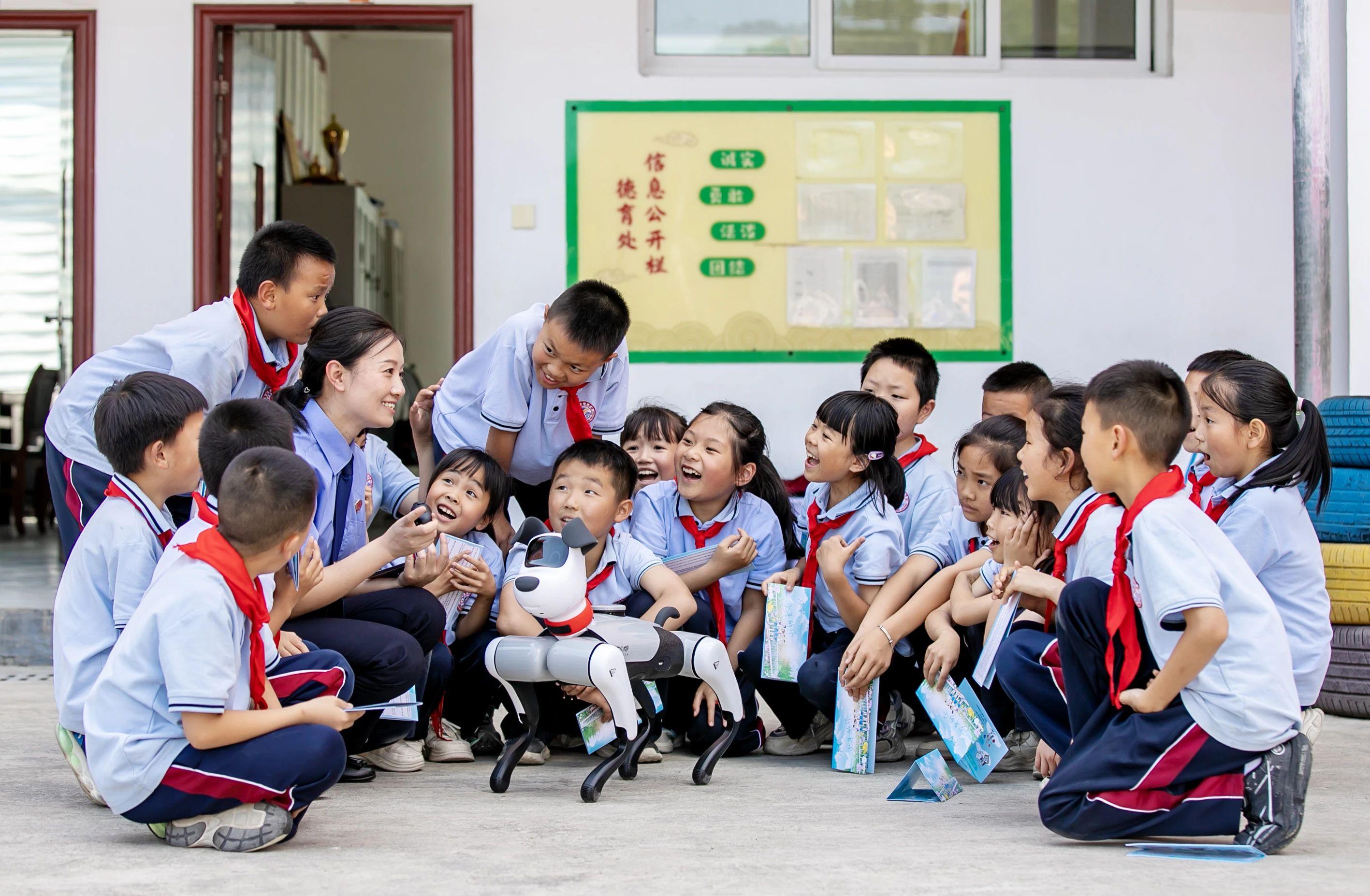 圖為檢察干警在惠風學校利用智能機器狗“妞妞”給學生宣講未成年人保護法。