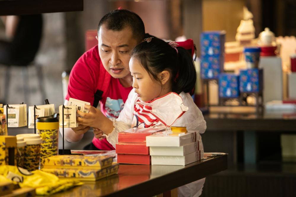 在重慶故宮文物南遷紀念館的角樓咖啡店,顧客在選購文創(chuàng)產(chǎn)品。新華社記者 儲加音 攝