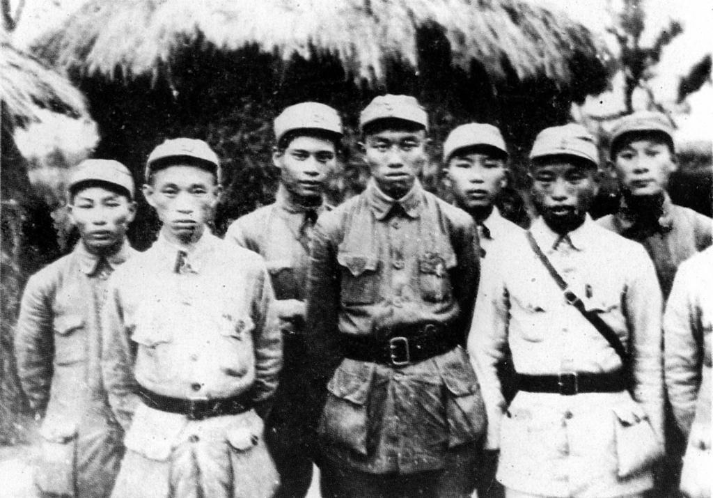 這是1939年初,新四軍第一支隊(duì)二團(tuán)部分干部在茅山的合影。左起第五位為蕭國(guó)生(資料照片)。新華社發(fā)