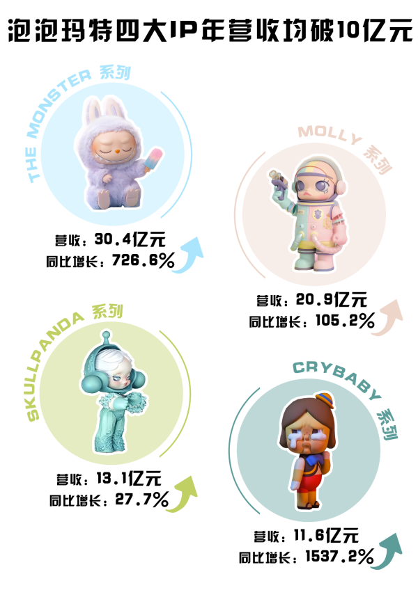 2025年4月,泡泡瑪特發(fā)布2024年報。報告顯示,2024年泡泡瑪特營收約130.4億元。其中,四大IP“THE MONSTERS”“MOLLY”“SKULLPANDA”“CRYBABY”的營收均突破10億元。LABUBU所屬的“THE MONSTERS”系列更是以30.4億元的營收額,726.6%的同比增幅,當之無愧成為泡泡瑪特旗下的第一IP。