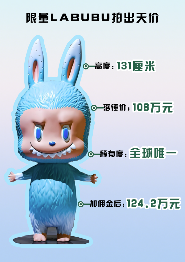 2025年6月10日,一件高131厘米的薄荷色初代LABUBU,以108萬元的價格落槌成交,創(chuàng)造了最貴LABUBU紀錄。