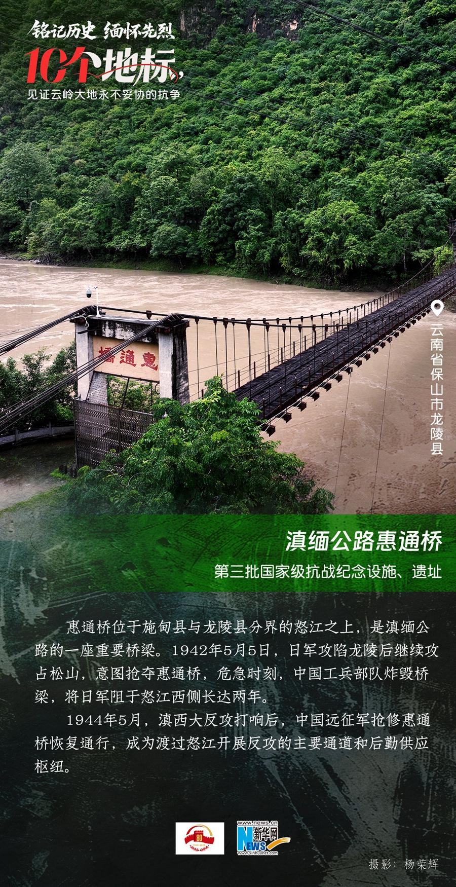 80年過去,曾經(jīng)的戰(zhàn)場硝煙雖散,但英氣永存。在國務(wù)院公布的前三批國家級抗戰(zhàn)紀(jì)念設(shè)施、遺址名錄中,云南省共有10個,分別為騰沖國殤墓園、騰沖滇西抗戰(zhàn)紀(jì)念館,龍陵抗日戰(zhàn)爭紀(jì)念館,國立西南聯(lián)合大學(xué)舊址,抗戰(zhàn)勝利紀(jì)念堂,松山戰(zhàn)役舊址,南洋華僑機工回國抗日紀(jì)念碑,怒江駝峰航線紀(jì)念館,施甸縣抗日江防遺跡群,滇緬公路惠通橋,滇西抗日戰(zhàn)爭紀(jì)念碑。它們承載著國人共同的歷史記憶與民族情感,也為我們學(xué)習(xí)和傳承抗戰(zhàn)精神提供了現(xiàn)實條件。