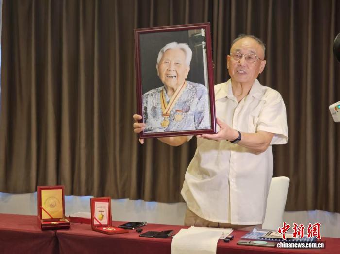 臺胞蘇菁之子張正光舉起2015年母親佩戴中國人民抗日戰(zhàn)爭勝利60周年、70周年紀念章拍下的照片。黃欣欣 攝