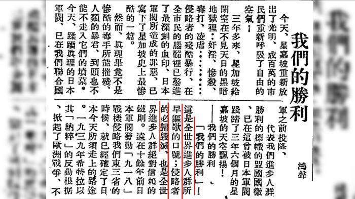 1945年9月9日出版的《星洲日報》與《總匯報》聯合版刊登《我們的勝利》的文章。圖片來源:新加坡國立大學官網