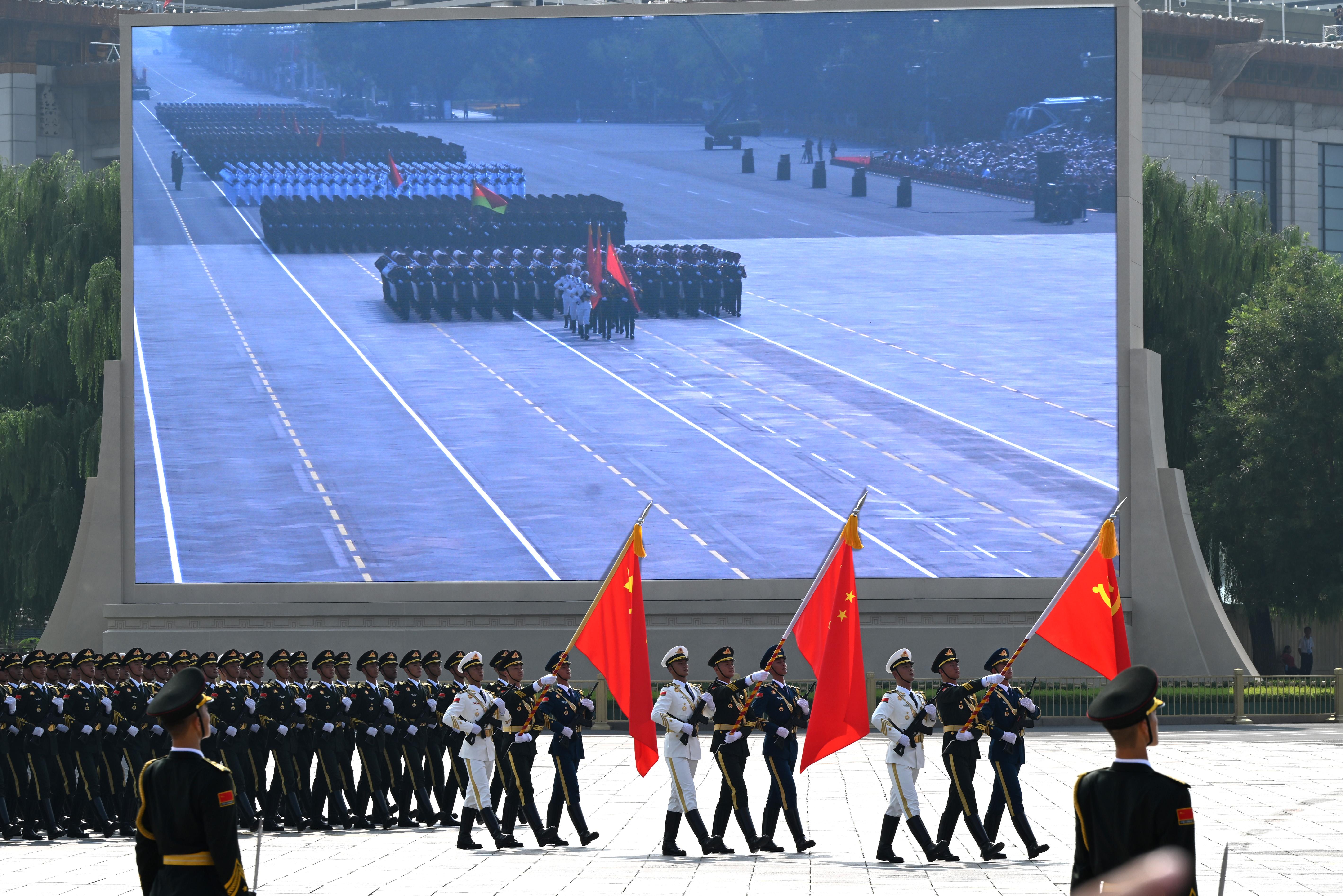9月3日,紀(jì)念中國(guó)人民抗日戰(zhàn)爭(zhēng)暨世界反法西斯戰(zhàn)爭(zhēng)勝利80周年閱兵式在北京隆重舉行。這是天安門(mén)廣場(chǎng)舉行升國(guó)旗儀式。