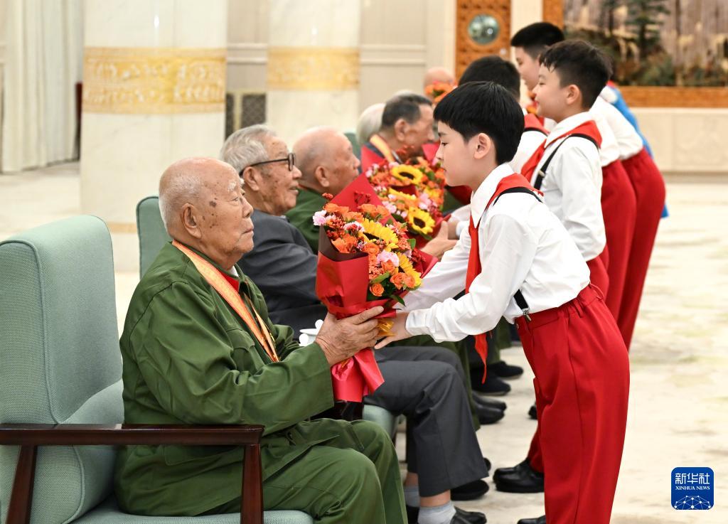9月3日晚,紀(jì)念中國(guó)人民抗日戰(zhàn)爭(zhēng)暨世界反法西斯戰(zhàn)爭(zhēng)勝利80周年文藝晚會(huì)《正義必勝》在北京人民大會(huì)堂隆重舉行。這是晚會(huì)開始前,少先隊(duì)員向前來觀看演出的抗戰(zhàn)老戰(zhàn)士老同志代表獻(xiàn)花。