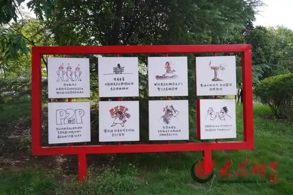 園區(qū)西南面休息區(qū)紅色支柱展示論述摘編九大主題目錄,北面紅色展板展示精選內(nèi)容,下方二維碼可在線瀏覽相關(guān)內(nèi)容。東南角學(xué)習(xí)驛站有互動軟件和觸屏機(jī)器,科普電信網(wǎng)絡(luò)詐騙知識。