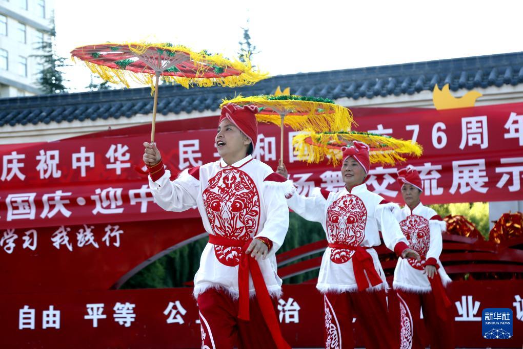 9月25日,在河南省洛陽市汝陽縣劉伶廣場,汝陽縣牡丹藝術團在表演陜西大秧歌《紅歌大聯(lián)唱》。