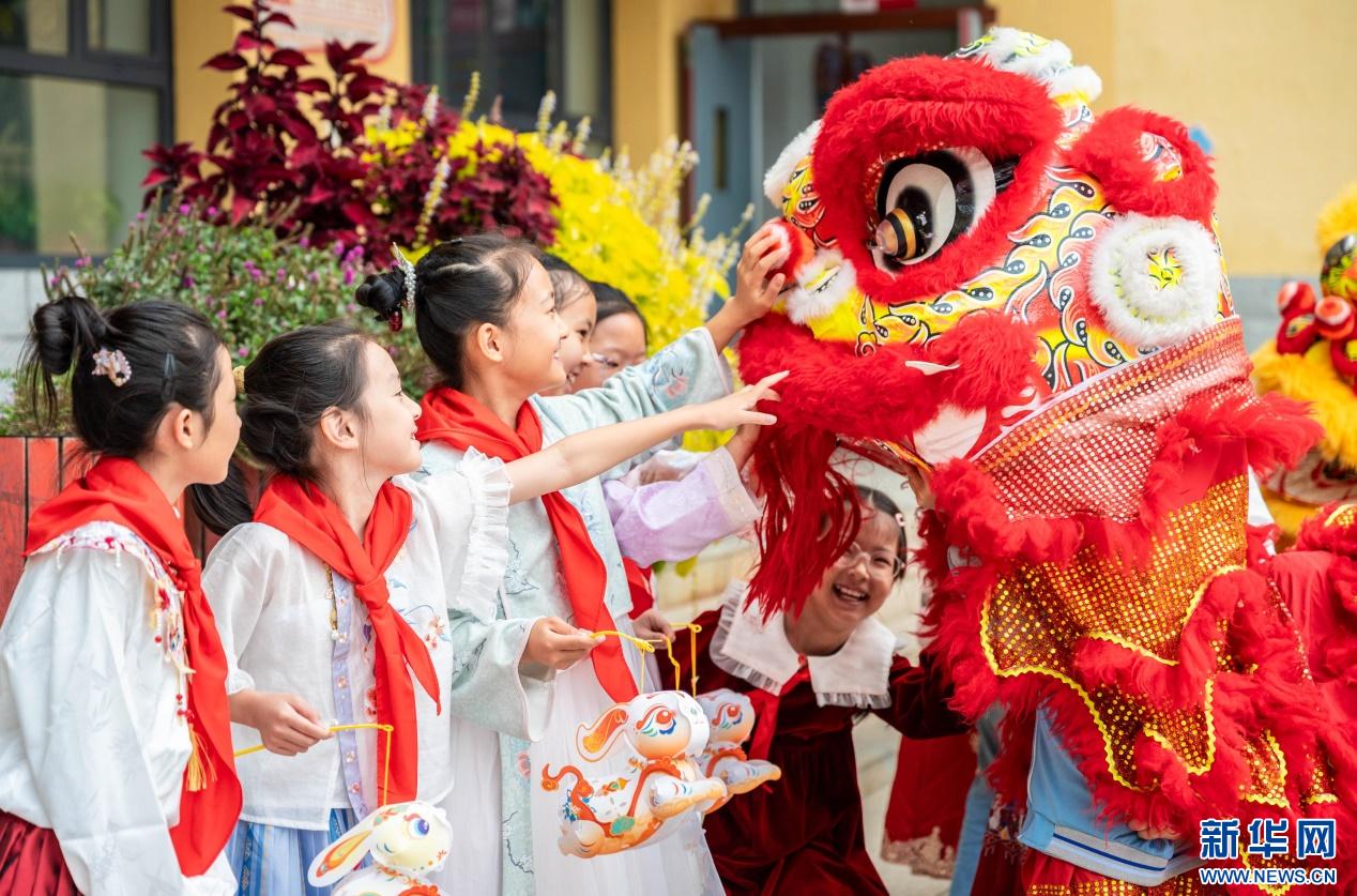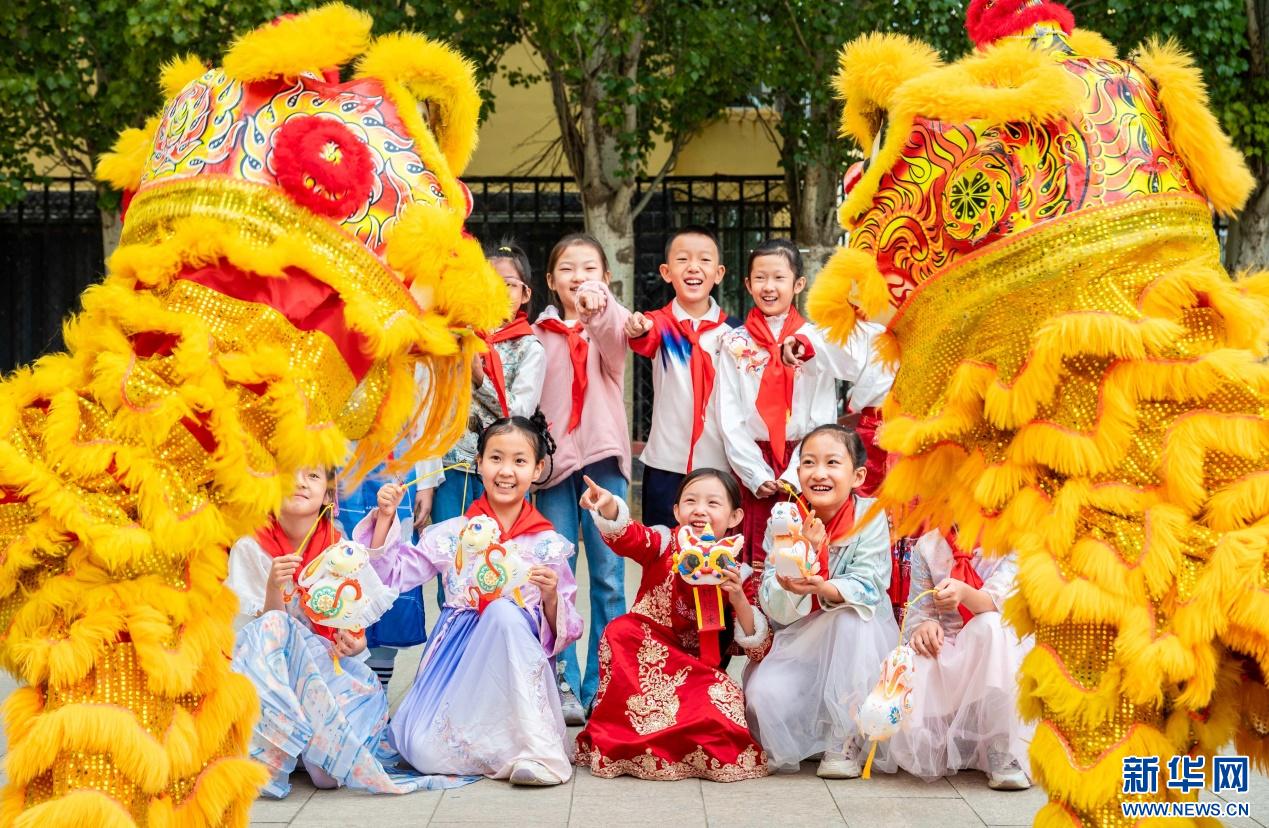 9月28日,呼和浩特市玉泉區(qū)清泉街小學表演舞獅的學生在中秋節(jié)主題活動上和同學們互動。新華網(wǎng)發(fā)(丁根厚 攝)