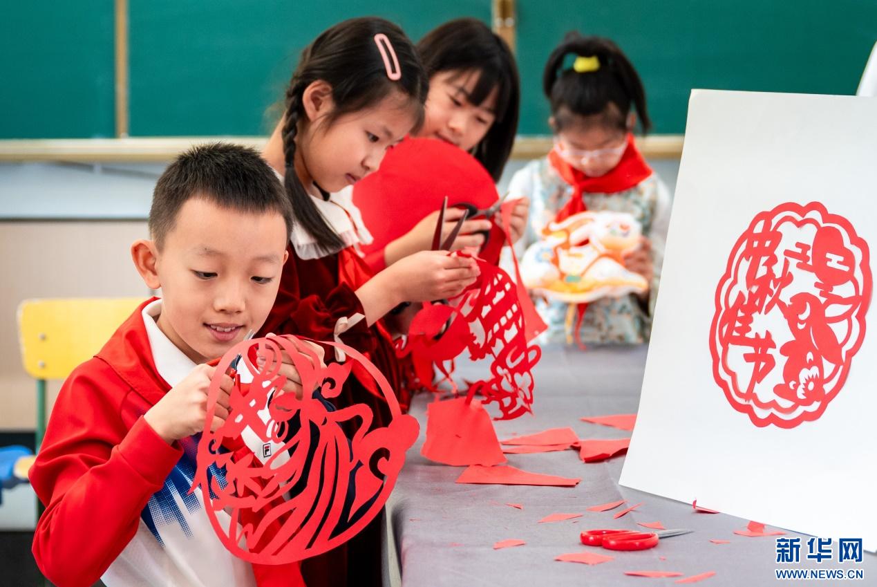 9月28日,呼和浩特市玉泉區(qū)清泉街小學學生在中秋節(jié)主題活動上制作剪紙作品。新華網(wǎng)發(fā)(丁根厚 攝)