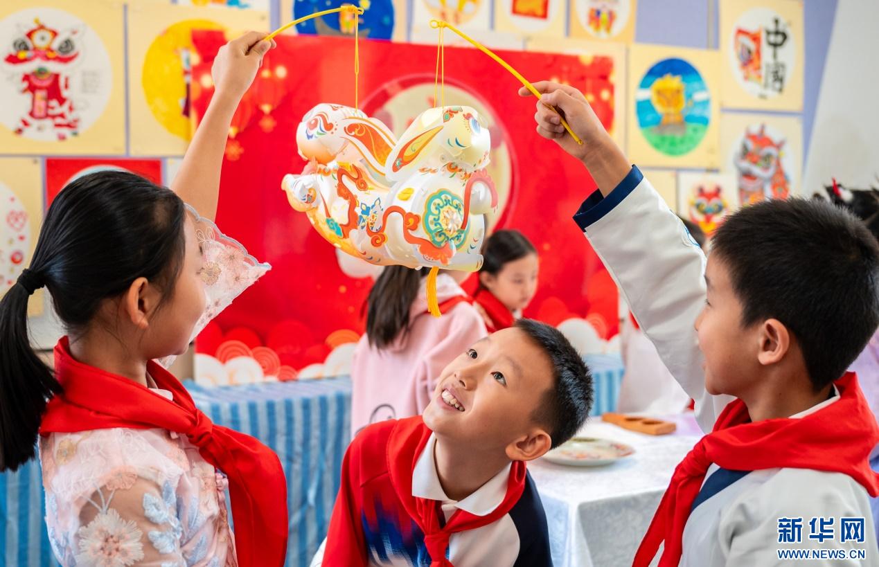 9月28日,呼和浩特市玉泉區(qū)清泉街小學學生在中秋節(jié)主題活動上觀賞玉兔花燈。新華網(wǎng)發(fā)(丁根厚 攝)