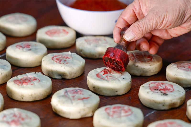 制餅師傅在“徽式麻仁月餅”上蓋印。新華網(wǎng)發(fā)(施亞磊 攝)