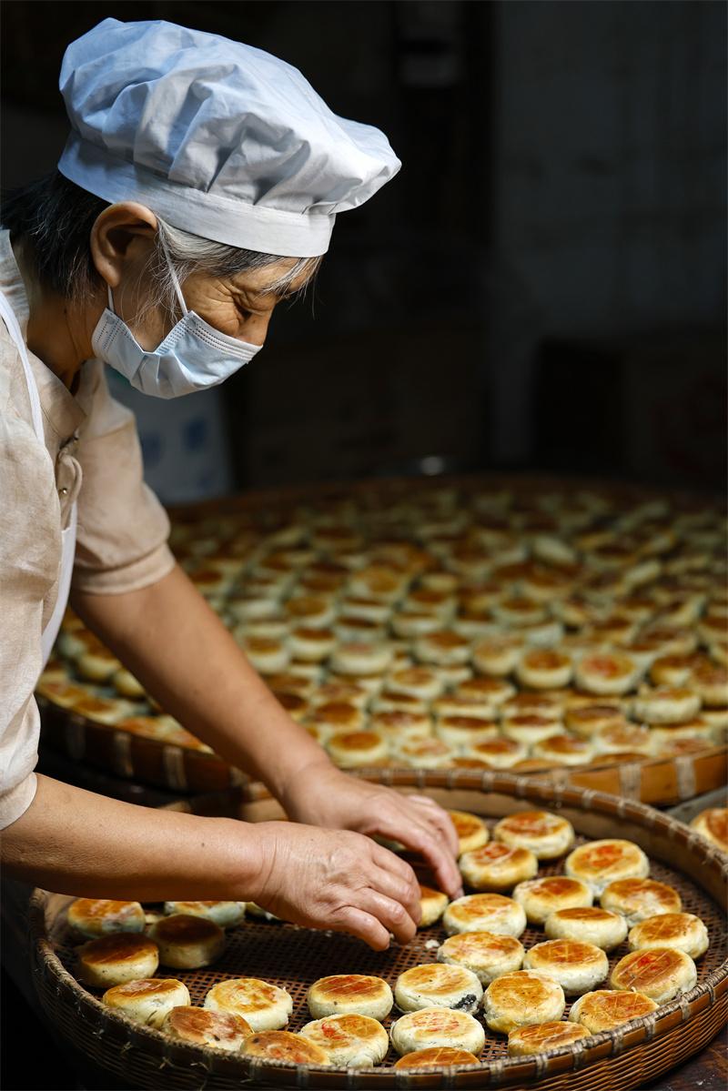 臨近中秋,在有著1700多年歷史的安徽省休寧縣萬安老街內(nèi),制餅師傅經(jīng)過“制油酥、搟面皮、包餡、固形、蓋印和烘烤”等多道工序后,制作出外酥里糯、口感鮮美的“徽式麻仁月餅”,作為古徽州中秋佳節(jié)傳統(tǒng)糕點(diǎn),深受百姓喜愛。