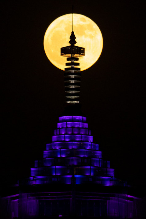 2022年6月14日,江蘇南京大報恩塔與“超級月亮”相映成景。新華社發(fā)(蘇陽 攝)