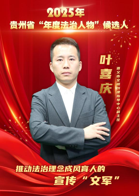 葉喜慶,現(xiàn)任貴州省遵義市文明創(chuàng)建指導(dǎo)中心副主任。2023年以來(lái),他立足本職、守正創(chuàng)新,將法治理念、法治思維與法治方式融入精神文明建設(shè)各方面,以實(shí)際行動(dòng)助推法治政府和文明遵義建設(shè)再上新臺(tái)階。