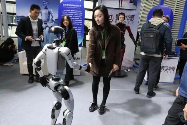2024年“互聯(lián)網(wǎng)之光”博覽會(huì)上,觀眾與人形機(jī)器人互動(dòng)。