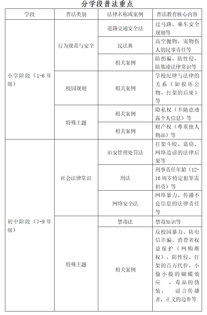 普法教育應(yīng)針對不同年齡段的學(xué)生開展有實效的普法教育,充分考慮不同年齡段的學(xué)生特點,提供定制化的普法教育內(nèi)容。普法內(nèi)容必須保持時效性與前瞻性,普法教育者應(yīng)及時關(guān)注最新的法律法規(guī)和司法實踐成果,并將其融入到校園普法教育中,為學(xué)生提供最新、最準(zhǔn)確的法律知識。以下是學(xué)校中小學(xué)生普法教育核心內(nèi)容清單之一,供參考。