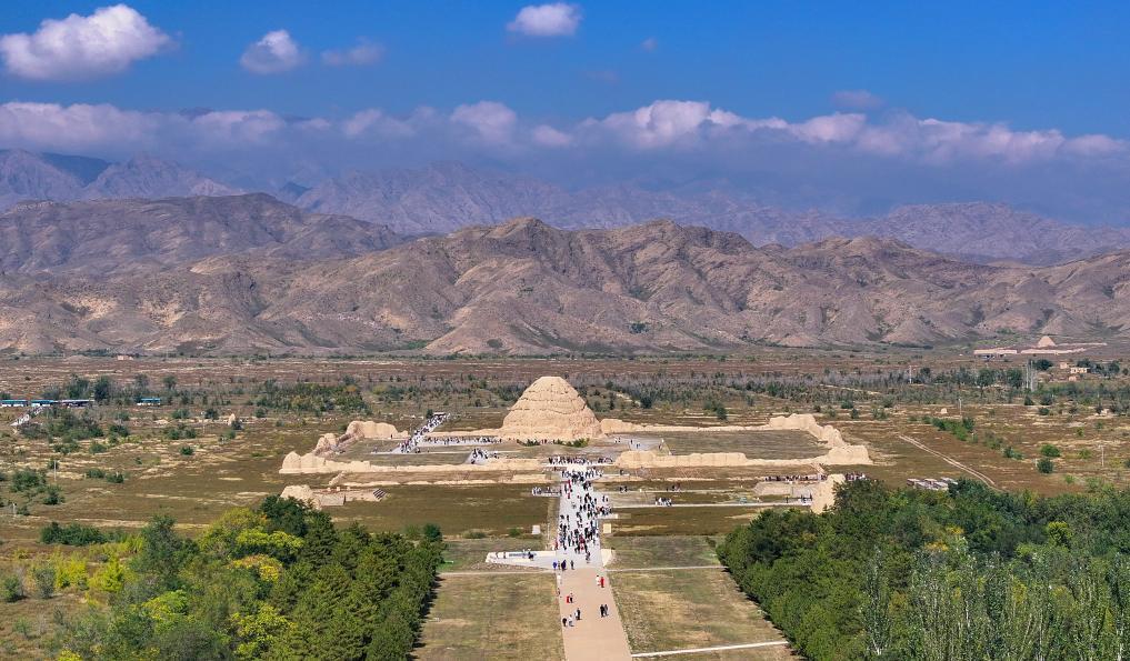 2025年10月2日,游客在西夏陵遺址區(qū)參觀三號陵(無人機(jī)照片)。新華社記者 馮開華 攝