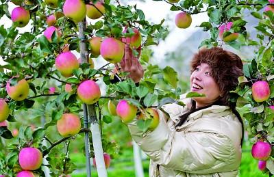 四川茂縣九頂農(nóng)牧蘋果園里,一名來自成都的游客體驗蘋果采摘。新華社發(fā)