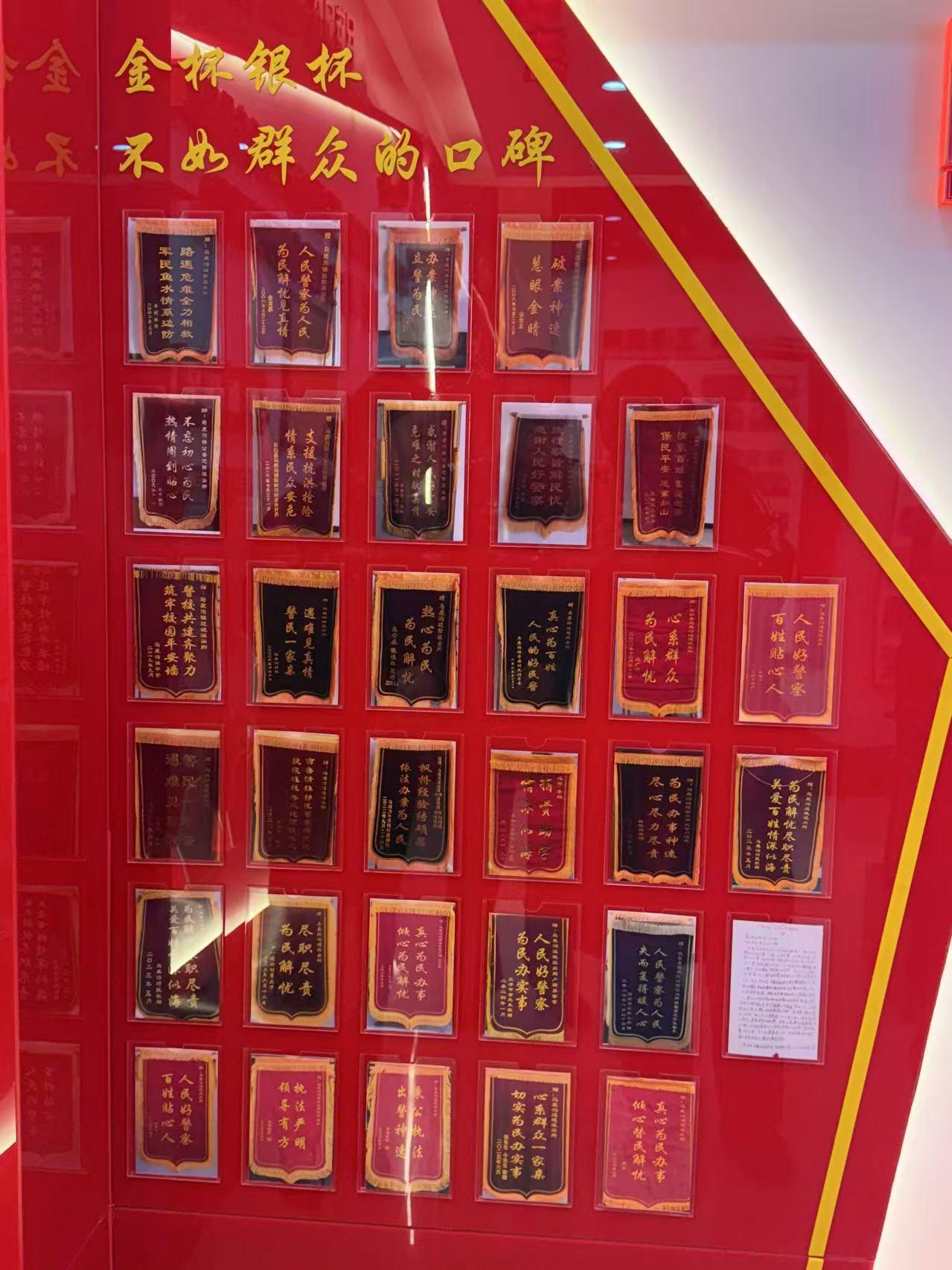 圖為馬鹿溝邊境派出所榮譽(yù)墻上群眾送的錦旗。張美欣 攝