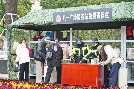 八一廣場是南昌核心地標、網(wǎng)紅打卡地。中午12時許,記者來到八一廣場,只見廣場上空紅旗迎風招展,現(xiàn)場人流如織。廣場東側(cè)設(shè)置的一處“警務(wù)站免費寄存點”格外醒目,里面放滿大大小小的箱包。
