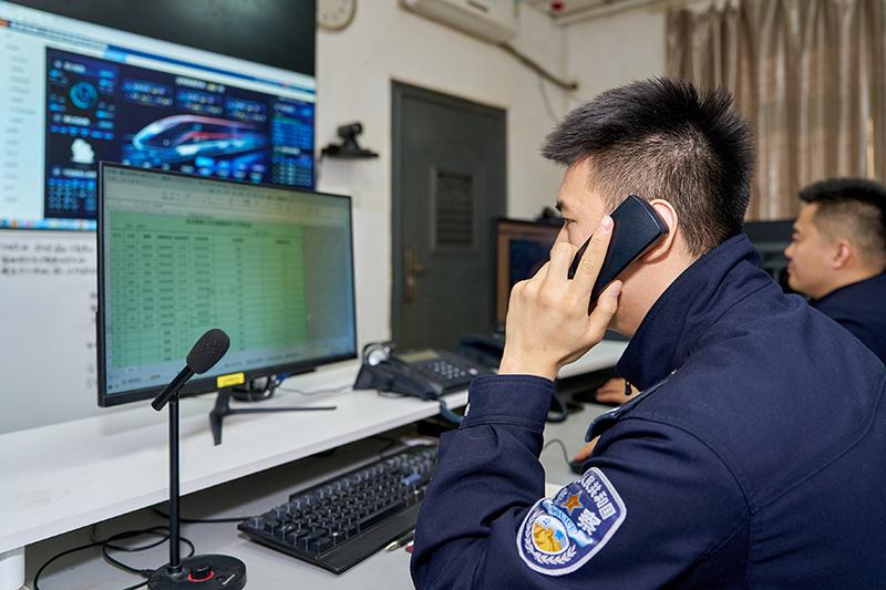 北京鐵路公安處乘警支隊綜合指揮室內(nèi),電話鈴聲、鍵盤敲擊聲此起彼伏。巨大的電子屏幕上,數(shù)十趟列車的運行狀態(tài)實時跳動。值班民警們的視線在幾塊屏幕間快速切換,這邊接起一個新來電,那邊還在記錄上一條警情的處置進展。