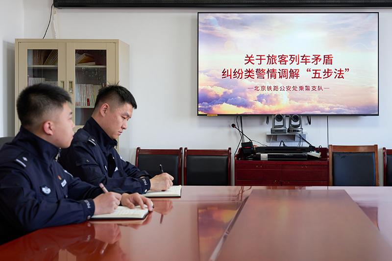 韓祎芃把“五步法”融進每一次接警。一次,一位年輕乘警來電求助:兩名旅客因座椅靠背起爭執(zhí),雙方情緒激動。韓祎芃一邊詢問現(xiàn)場關(guān)鍵信息,一邊逐條拆解:“先把雙方暫時隔開,分別勸導??纯粗車袥]有旅客愿意作證,把事實厘清……”他沒有直接給答案,而是一步步帶著對方走完“五步”。不一會兒,電話那頭傳來聲音:“握手了,調(diào)解成功了?!?nbsp;