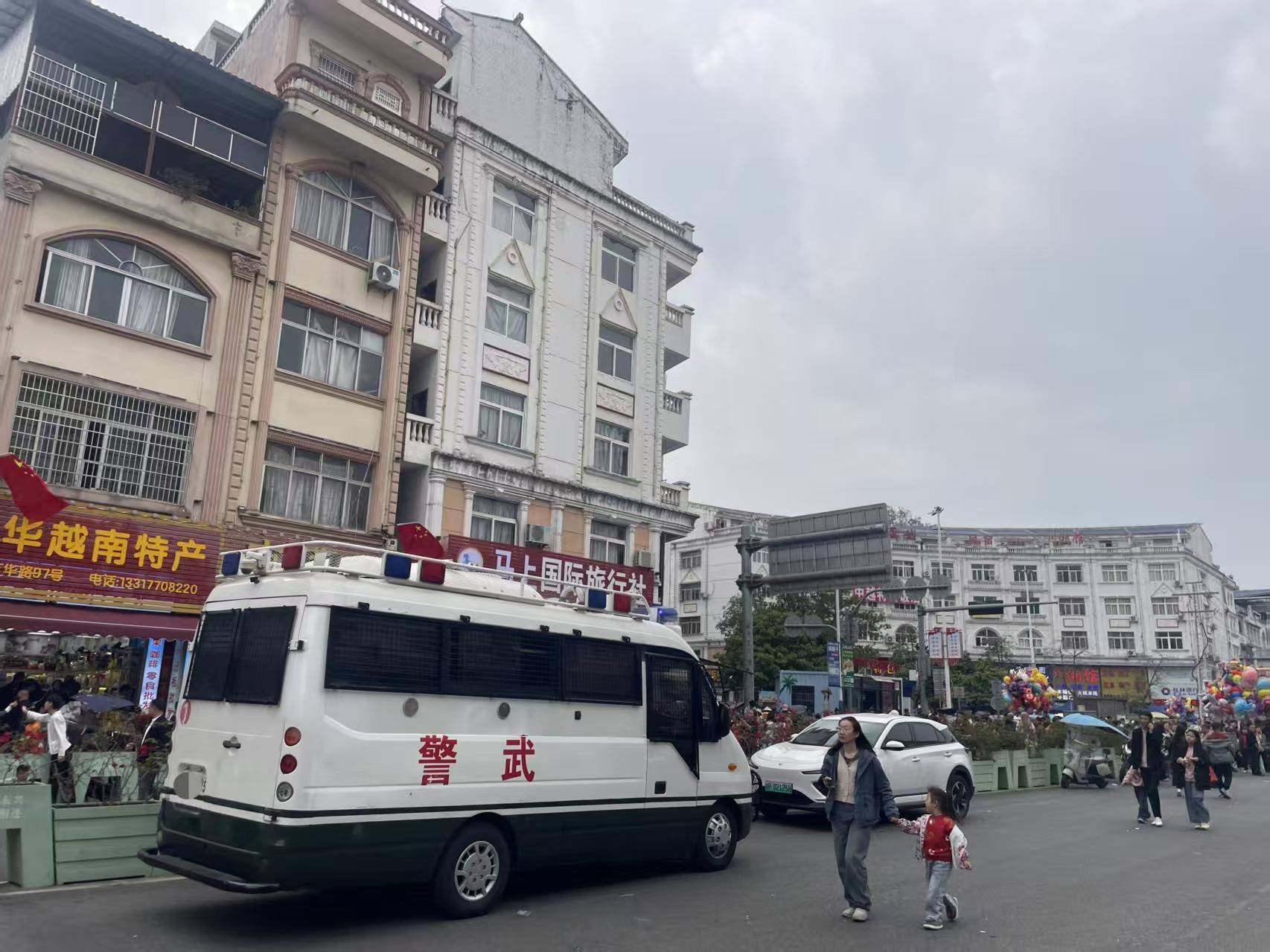 記者看到,幾名警察正在東興國門旅游區(qū)內(nèi)巡邏。春節(jié)期間,國門景區(qū)客流量較大,為了確保游客玩得安心、走得順暢,從清晨的第一批游客過關(guān),到深夜的最后一批游客返回,他們守護(hù)著這座邊境城市的平安。