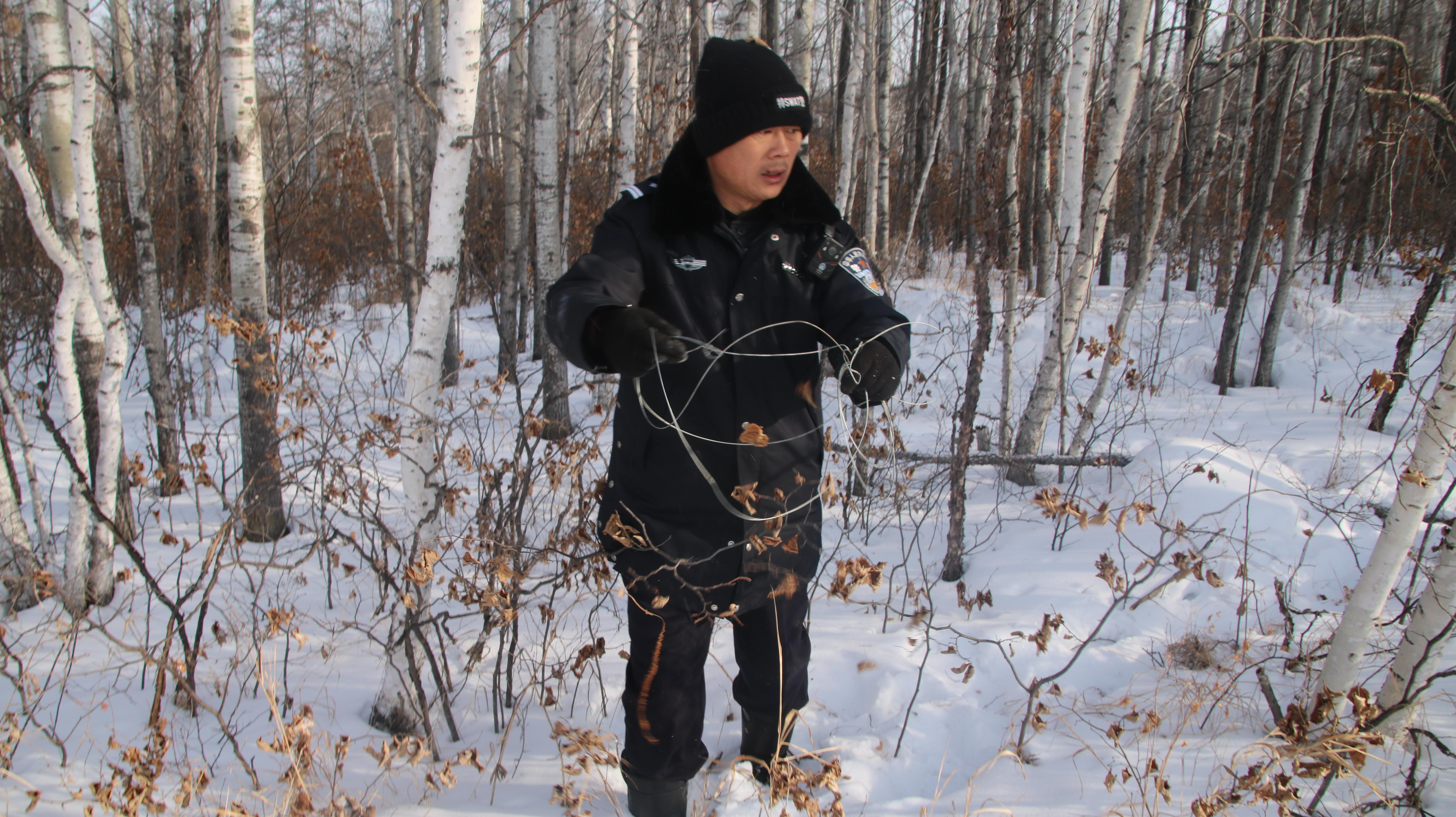 “蘇力得,你看這邊!”王云良在一處灌木叢旁停下,撥開積雪,一根細(xì)細(xì)的鋼絲繩套赫然出現(xiàn),一端牢牢拴在樹干上,另一端隱沒在枯草中,“這是針對(duì)狍子、野兔設(shè)置的獵套,要是有人不小心踩進(jìn)去,后果不堪設(shè)想。”