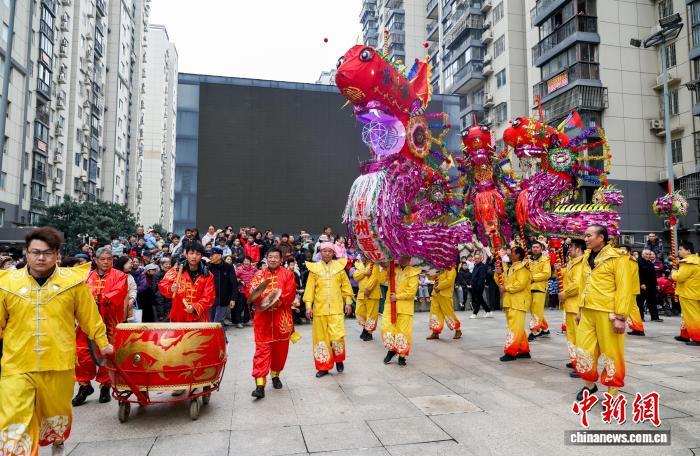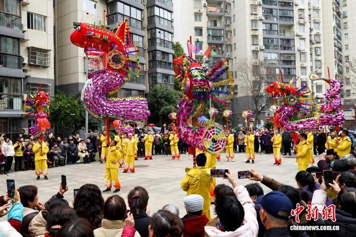 2月27日,湖北武漢,國家級非遺漢陽高龍走進(jìn)社區(qū)進(jìn)行表演,以傳統(tǒng)民俗為居民送上馬年元宵祝福。圖為高龍表演吸引民眾觀看。中新社記者 張暢 攝