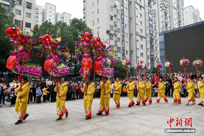 2月27日,湖北武漢,國家級非遺漢陽高龍走進(jìn)社區(qū)進(jìn)行表演,以傳統(tǒng)民俗為居民送上馬年元宵祝福。圖為高龍隊隊員們?yōu)榫用襁M(jìn)行表演。中新社記者 張暢 攝