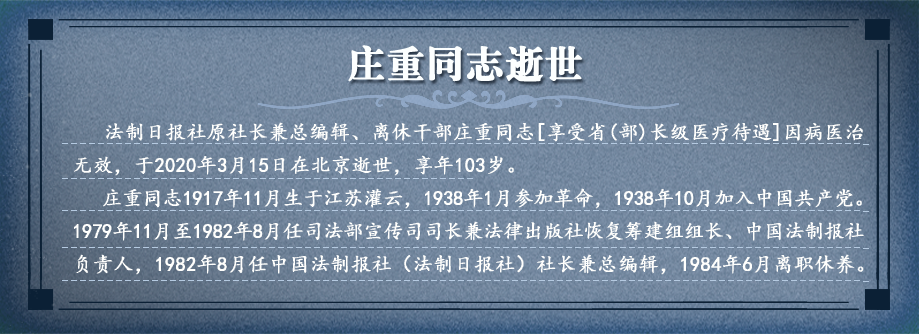 莊重老社長逝世,我很悲慟。悲慟之余,他在法制報創(chuàng)辦初期的感人事跡浮現(xiàn)在我的腦海中。 1979年,中央組織部向在京各部委發(fā)文,要求抽調(diào)一批干部支援公安部、最高檢、最高法、司法部、民政部、安全部。莊重同志于1979年11月調(diào)入司法部,分配在宣傳司為負(fù)責(zé)人,同時領(lǐng)導(dǎo)籌備法制報,這時宣傳司與法制報為同一個單位,兩年后分開。分開時莊重為宣傳司司長、法制報社黨委書記、社長、總編輯,一時身兼四職,可見人氣十足。【詳細(xì)】