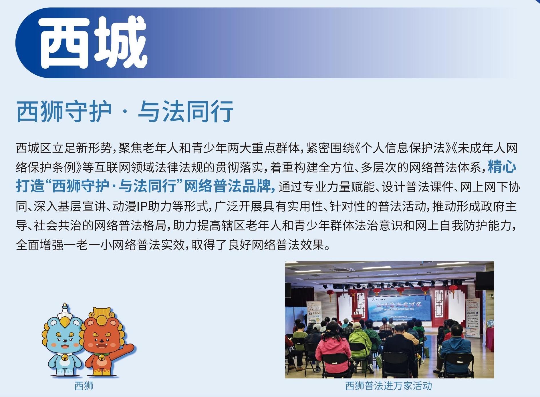 西城區(qū)立足新形勢,聚焦老年人和青少年兩大重點(diǎn)群體,緊密圍繞《個人信息保護(hù)法》未成年人網(wǎng)絡(luò)保護(hù)條例》等互聯(lián)網(wǎng)領(lǐng)域法律法規(guī)的貫徹落實(shí),著重構(gòu)建全方位、多層次的網(wǎng)絡(luò)普法體系,精心打造“西獅守護(hù)·與法同行”網(wǎng)絡(luò)普法品牌。[詳細(xì)]