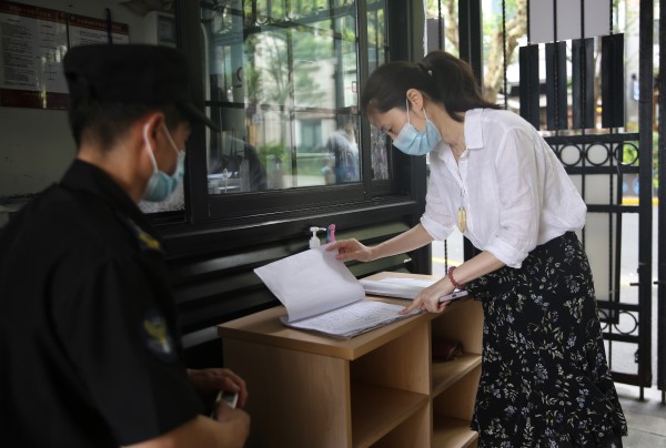 馬當(dāng)路278弄,西成里大門口,黃浦區(qū)人大代表、淮海中路街道西成居委會主任戴瑾正在跟門衛(wèi)袁師傅核對進(jìn)入人員信息。